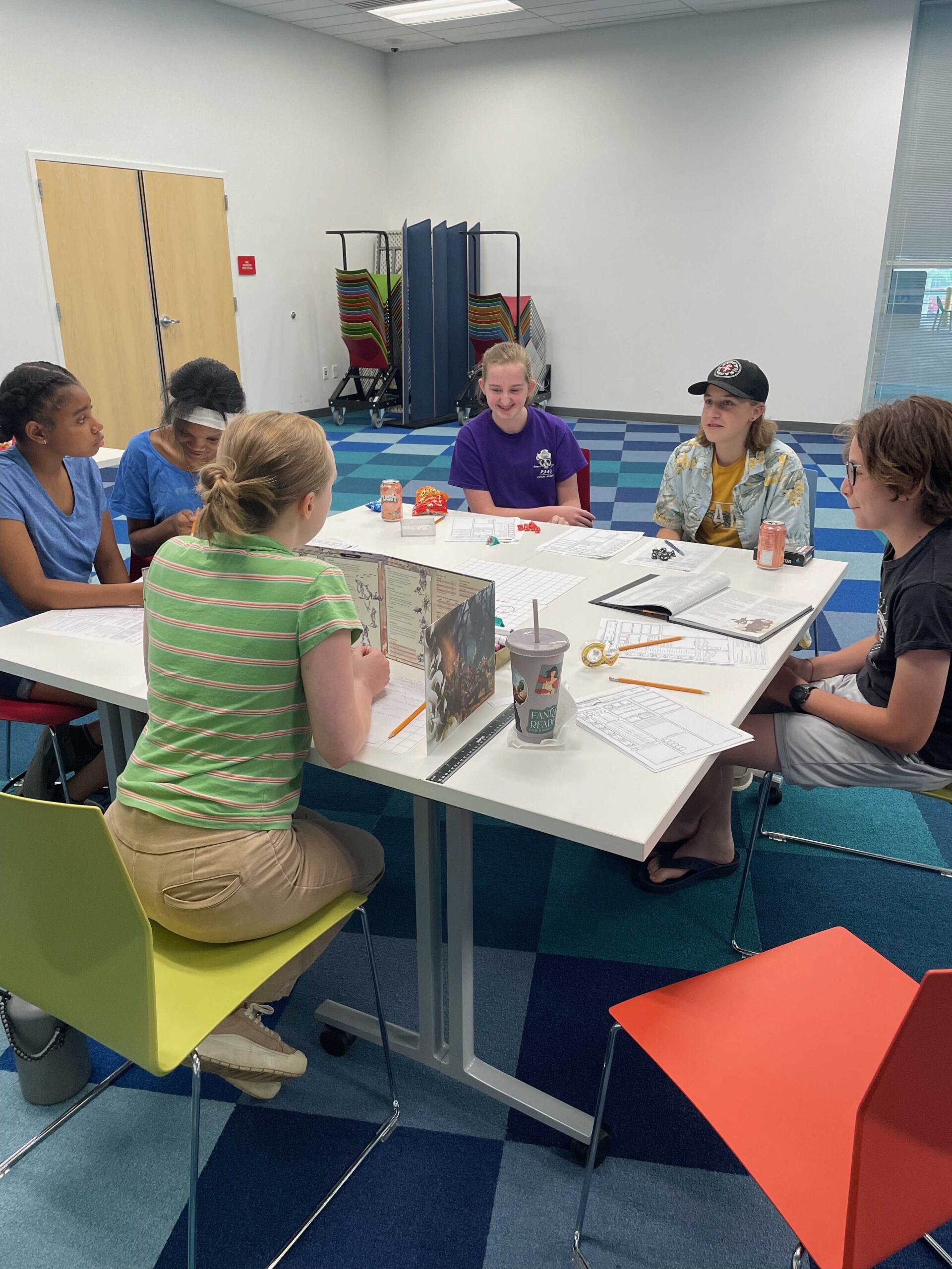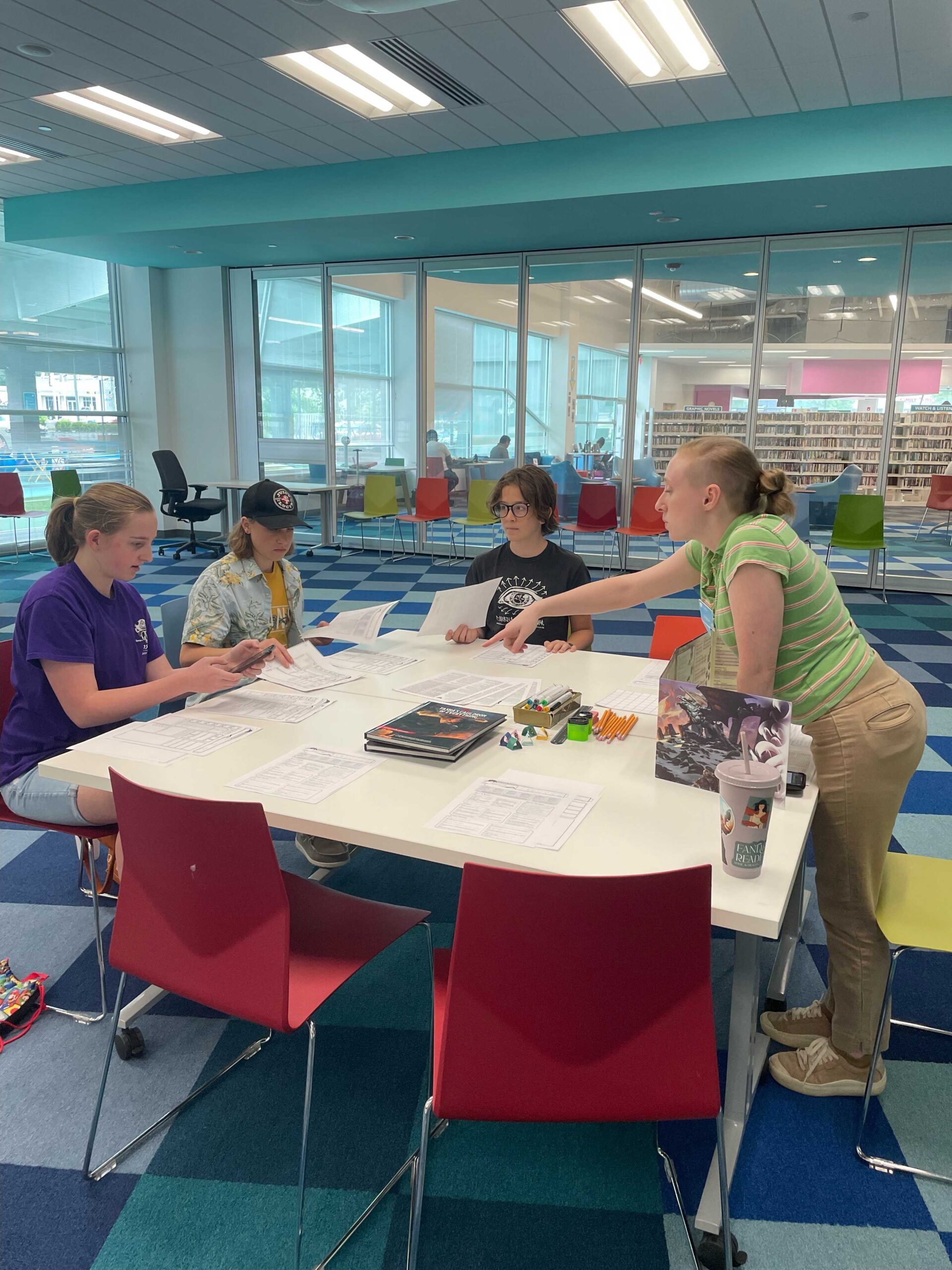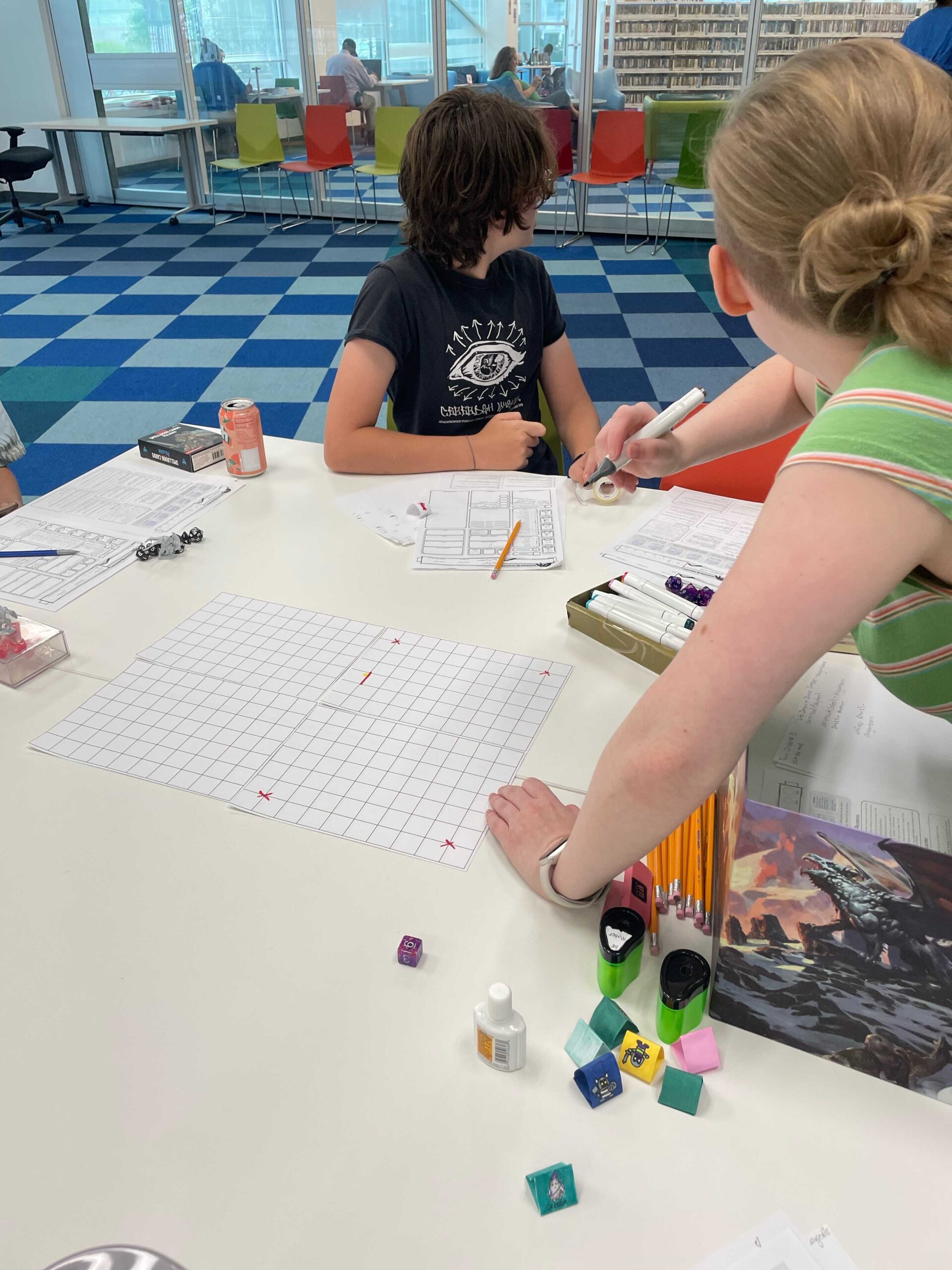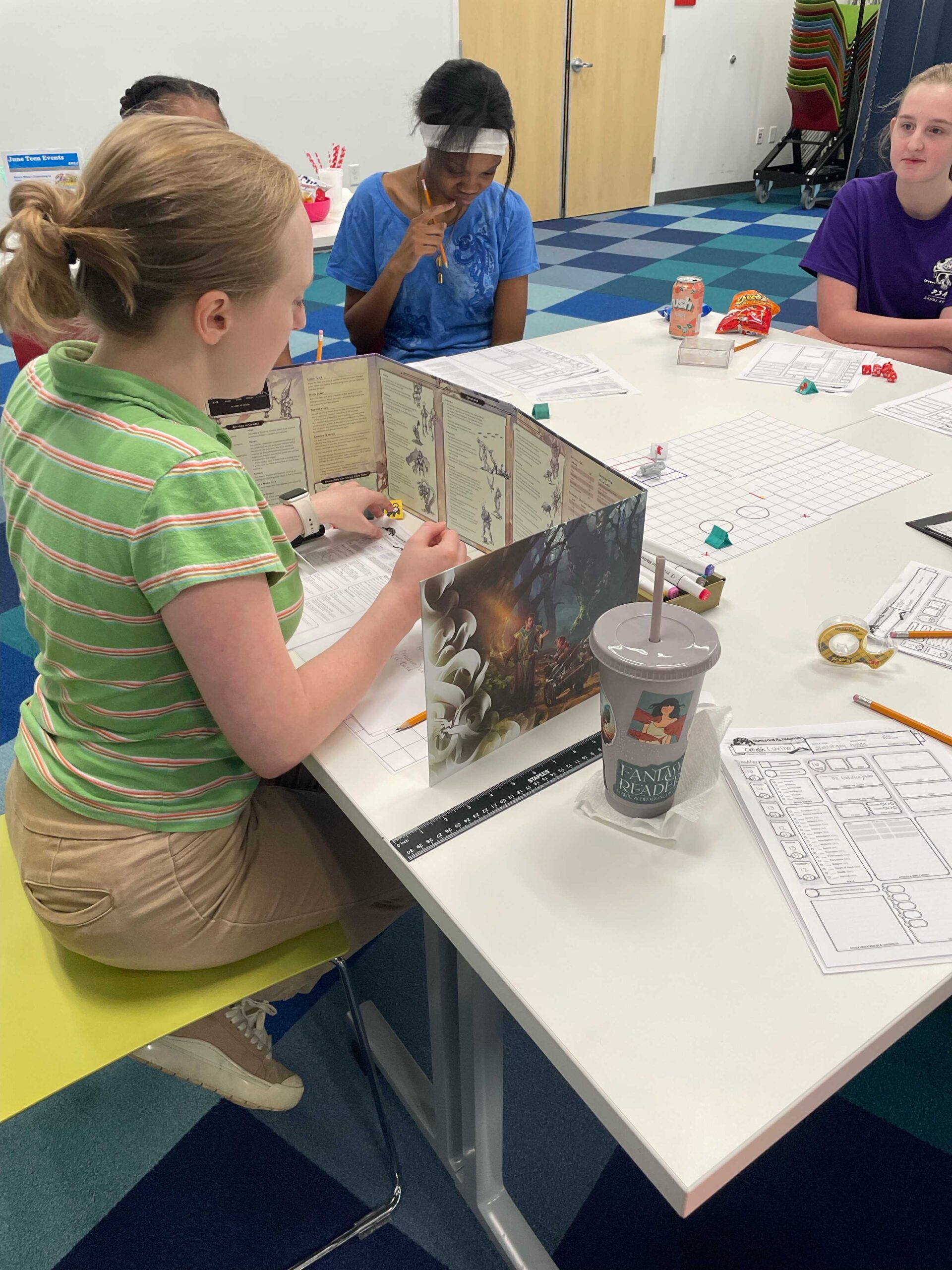 Up until now, I have been DMing for them (running the game), but as the program has expanded, I’m in the process of teaching teens how to DM for each other, and now some volunteers are getting involved too!