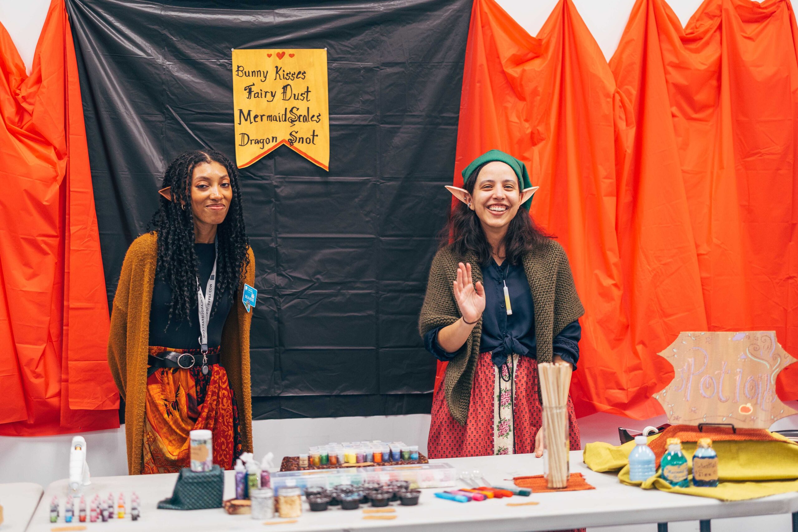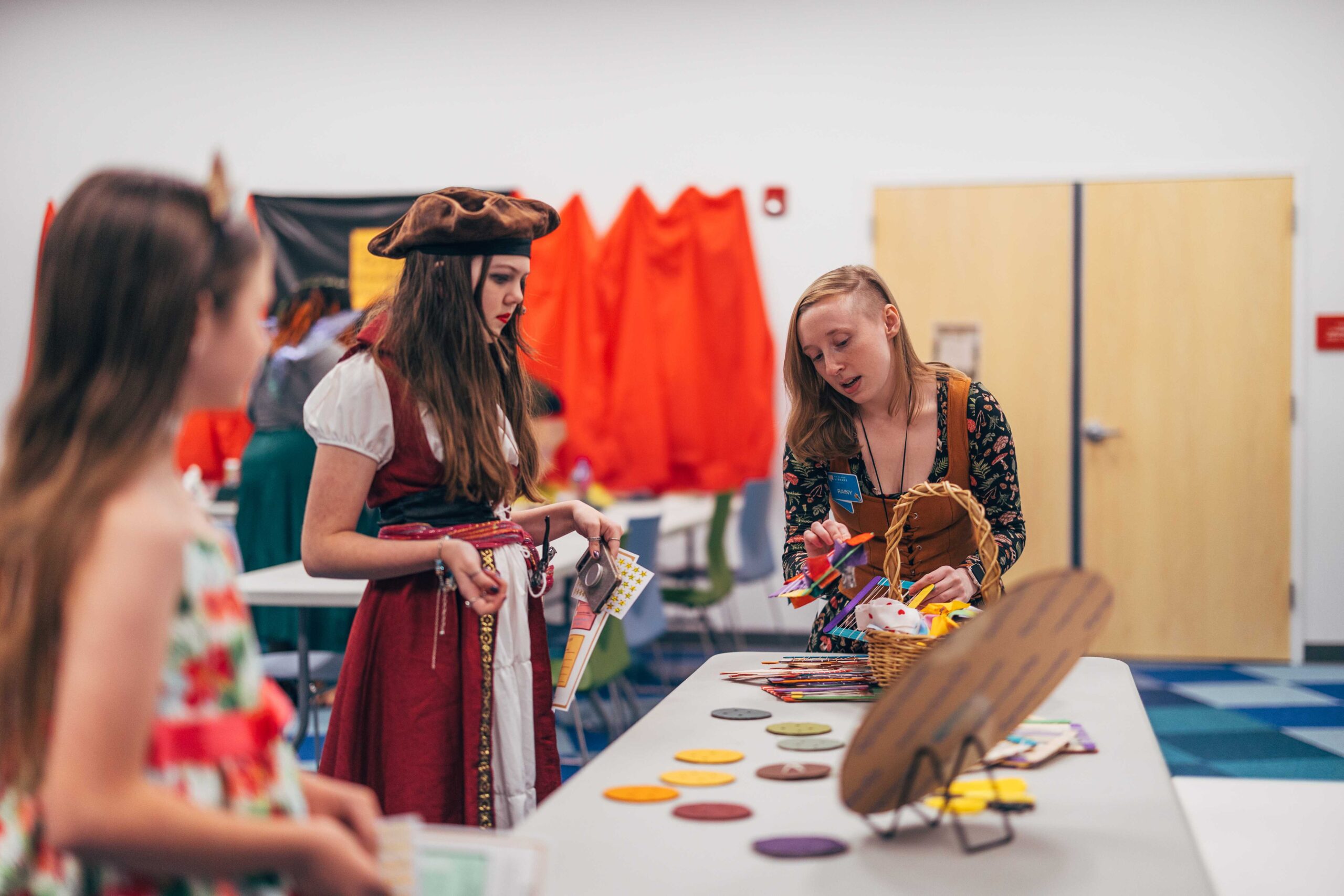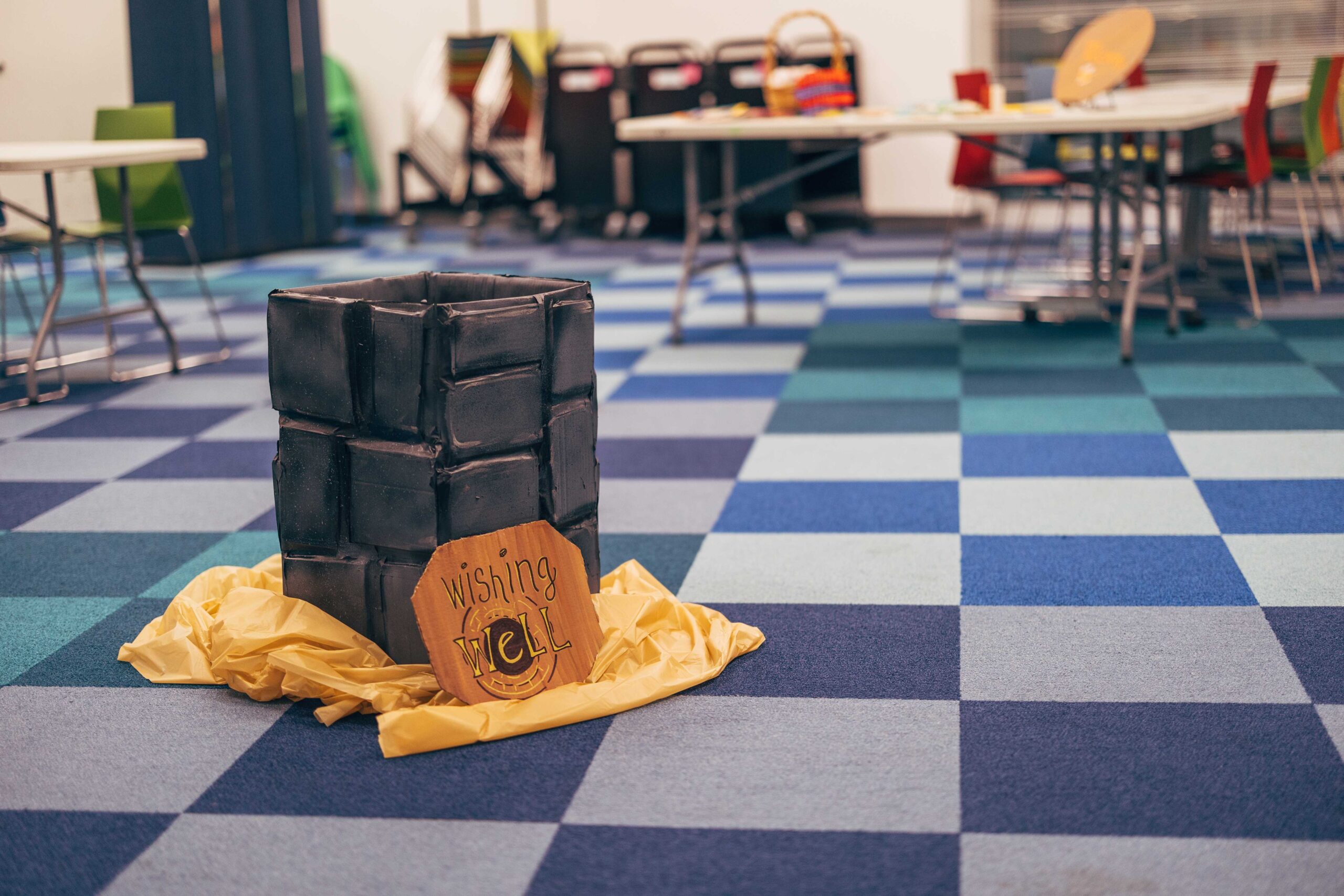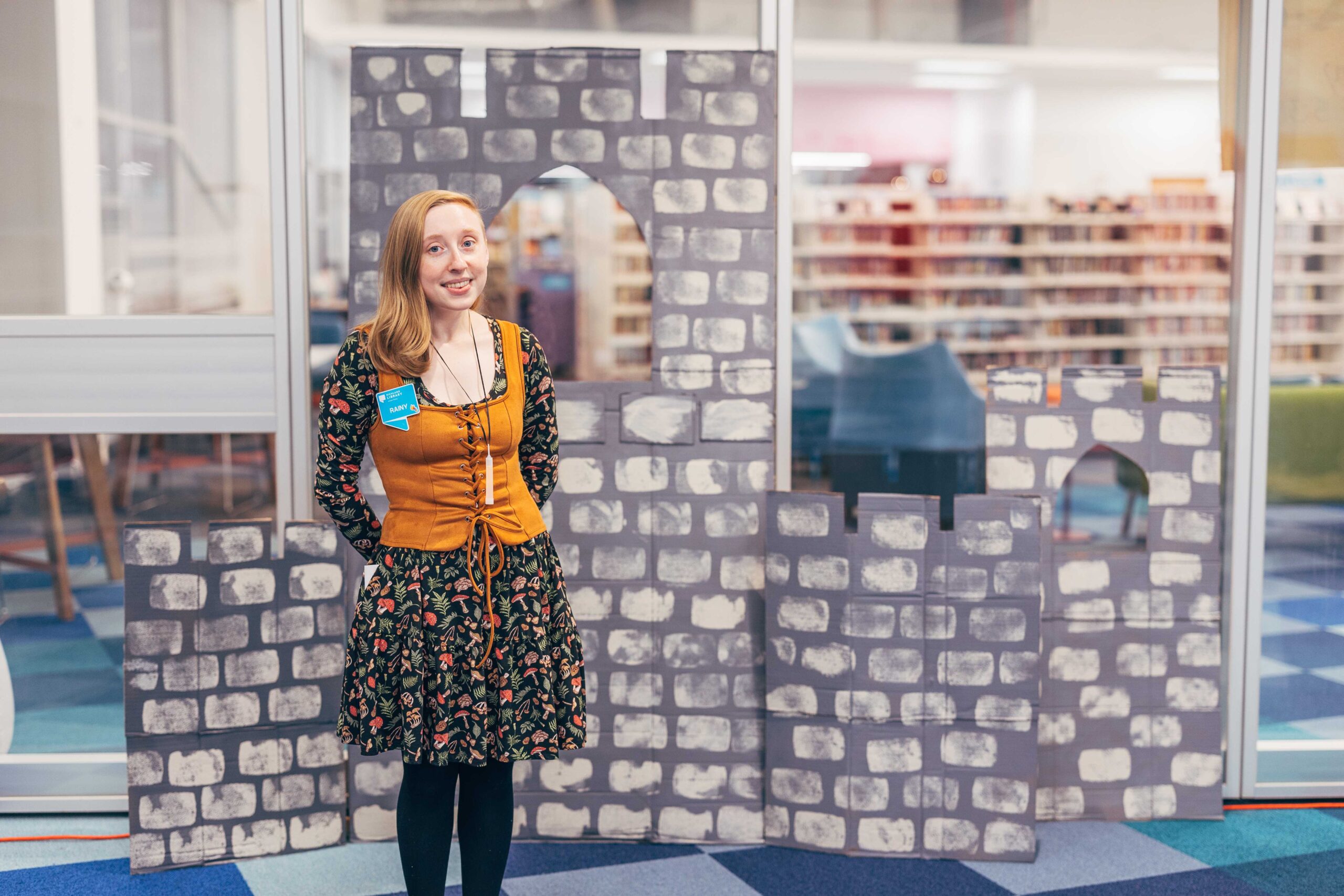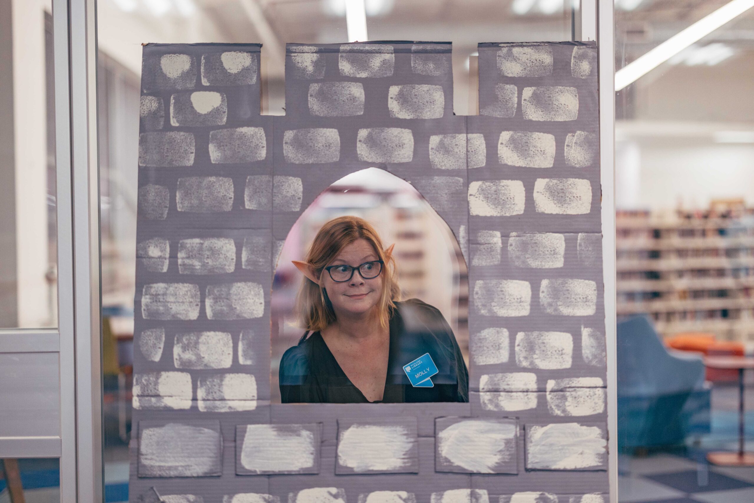 Southeast’s Social Meeting Lab turned into a medieval market. We made signs out of cardboard (painted to look like wood), hung red tablecloths like curtains, and I constructed a cardboard castle backdrop with wooden bracers for a photo-op. I also made a wishing well out of cardboard, tape, and spray paint. Staff who wanted to participate wore their elf ears, fairy wings, and other accessories that fit the vibe.
