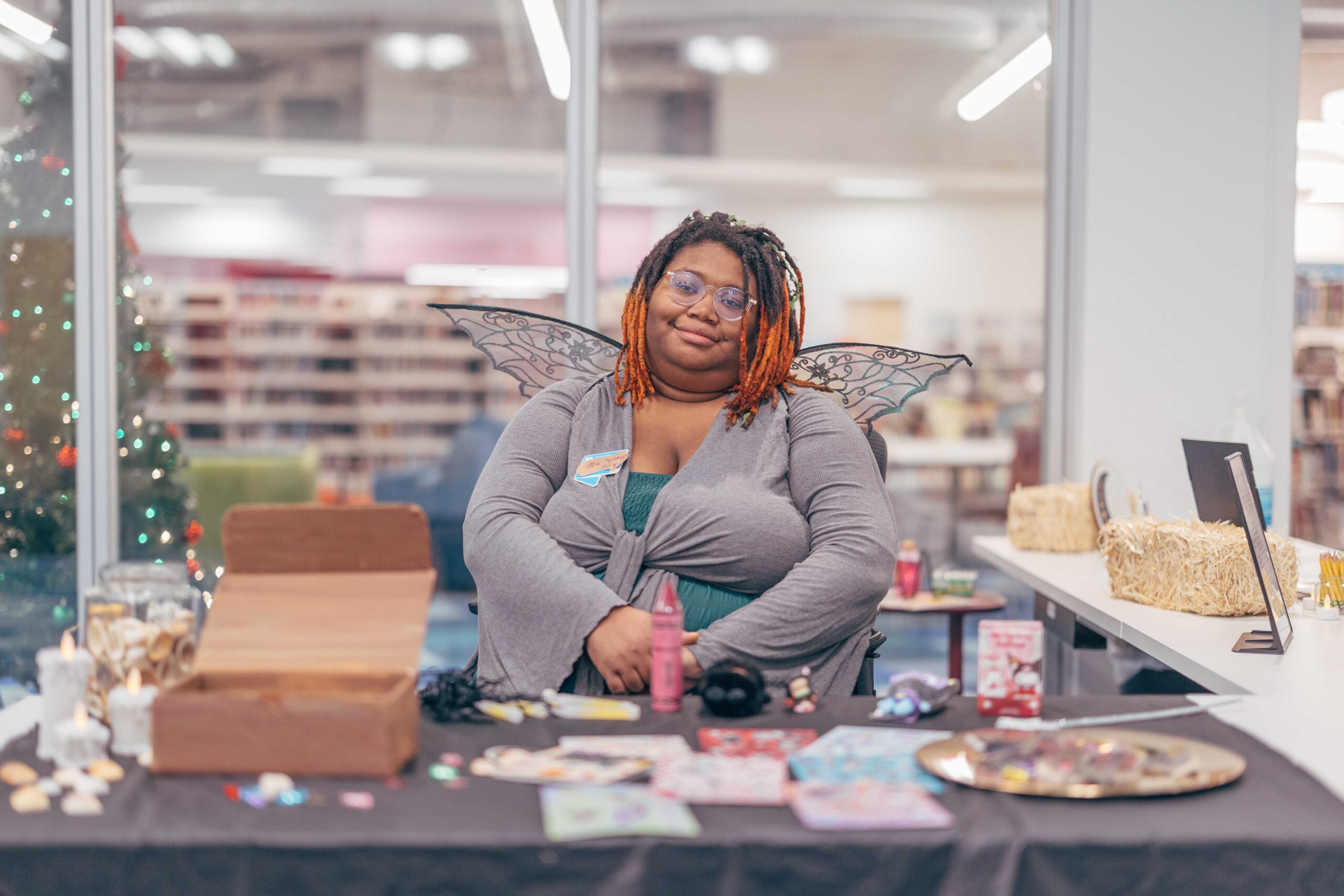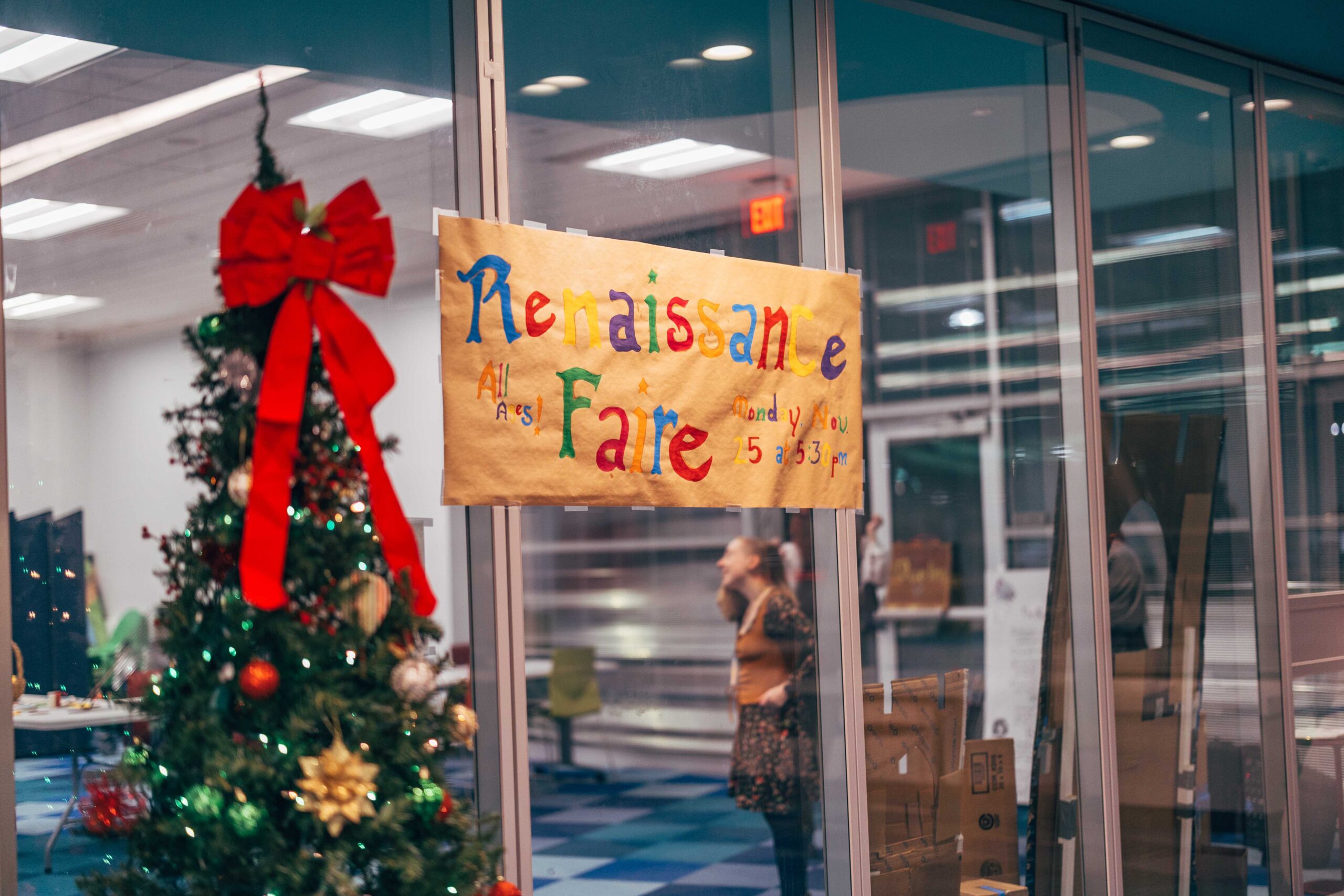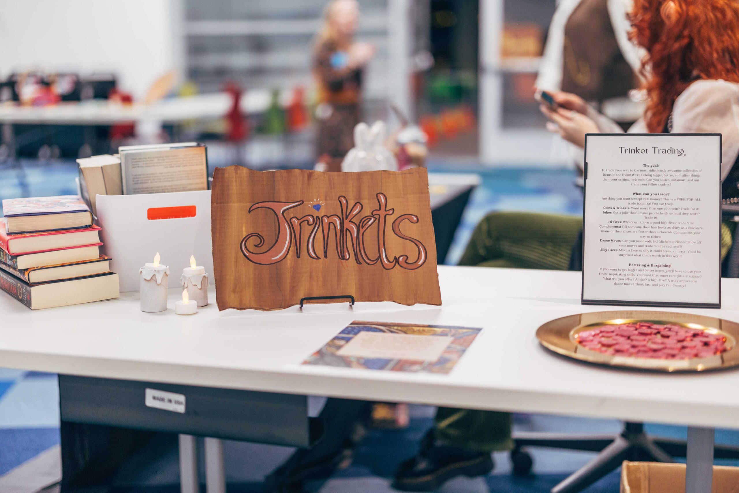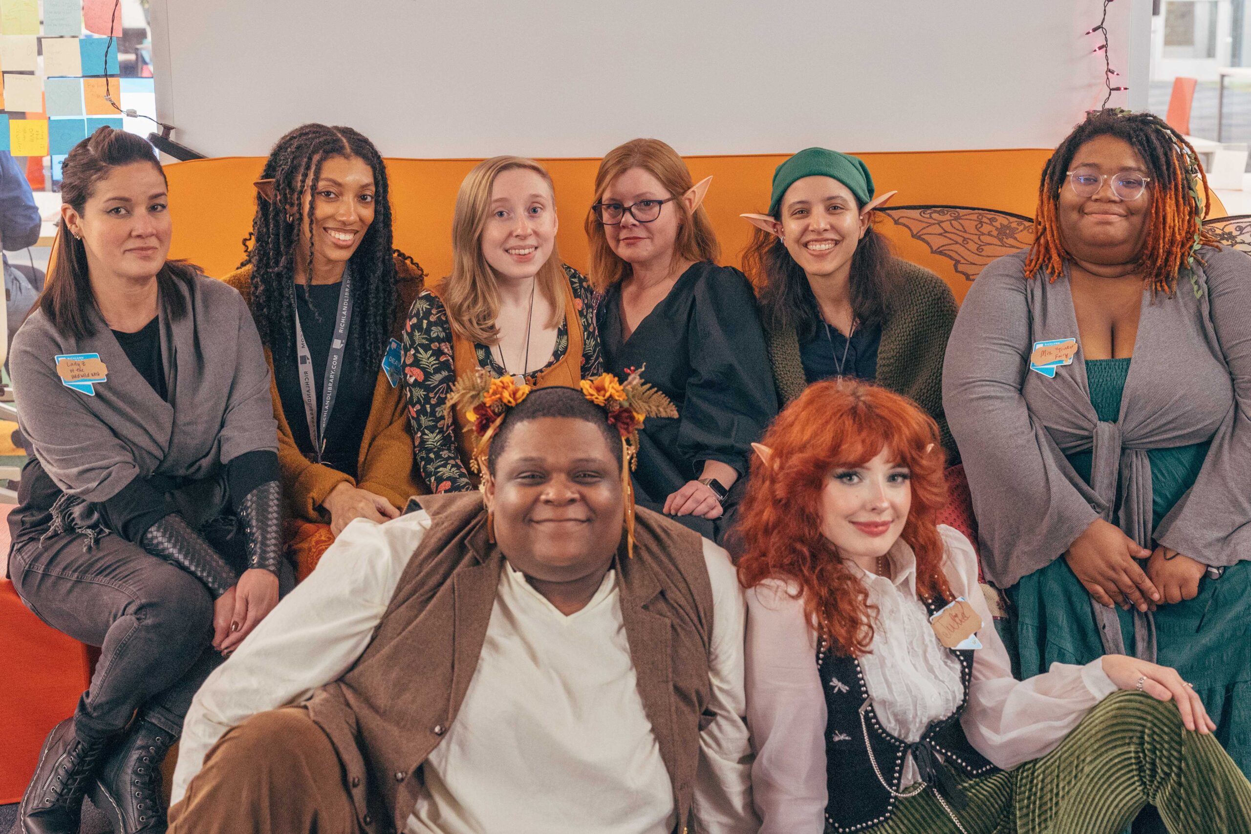 Southeast’s Social Meeting Lab turned into a medieval market. We made signs out of cardboard (painted to look like wood), hung red tablecloths like curtains, and I constructed a cardboard castle backdrop with wooden bracers for a photo-op. I also made a wishing well out of cardboard, tape, and spray paint. Staff who wanted to participate wore their elf ears, fairy wings, and other accessories that fit the vibe.