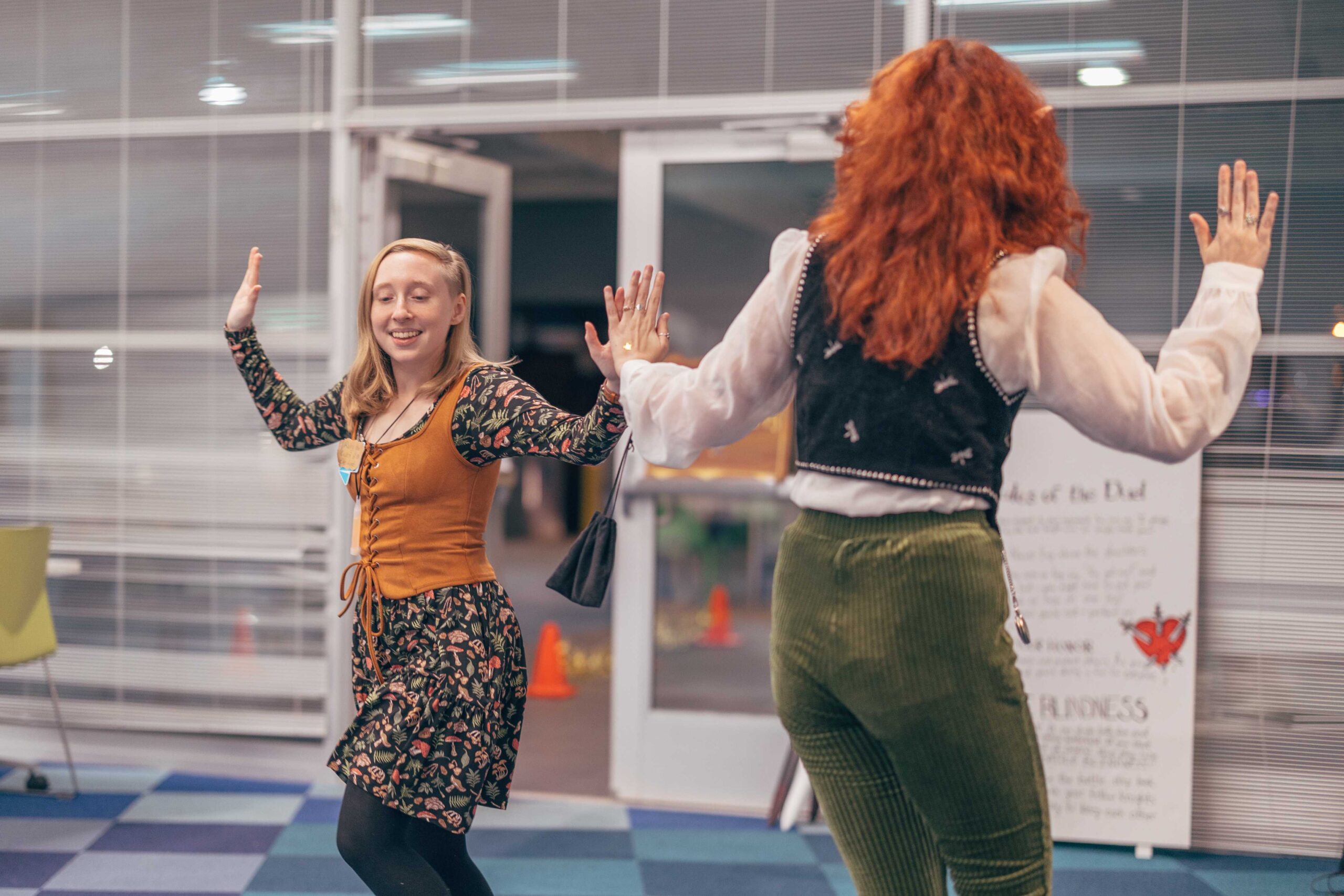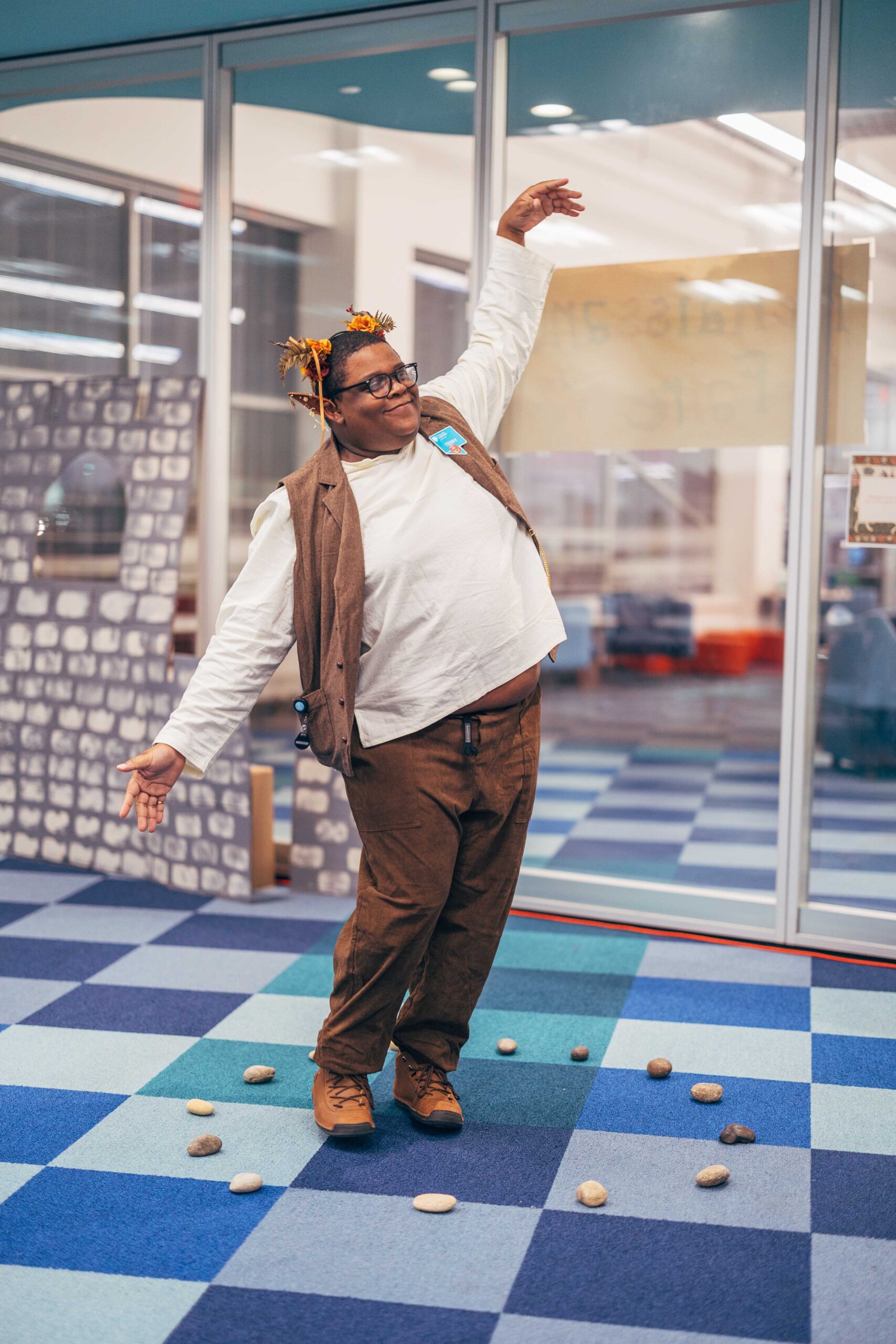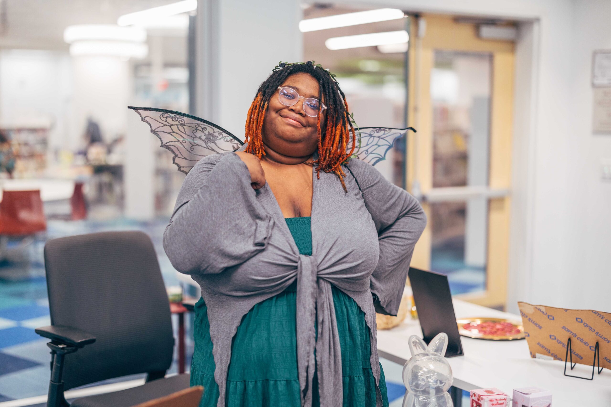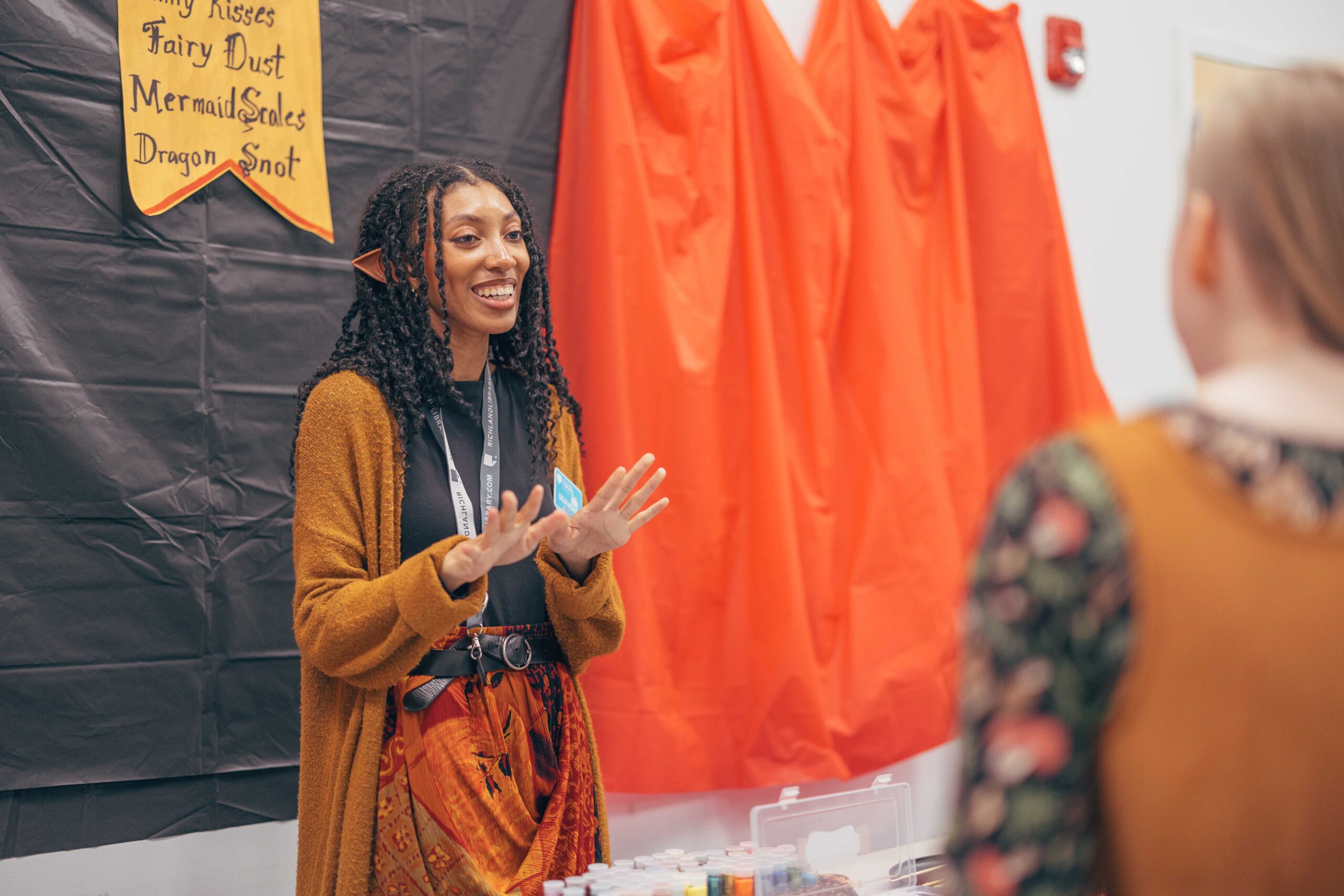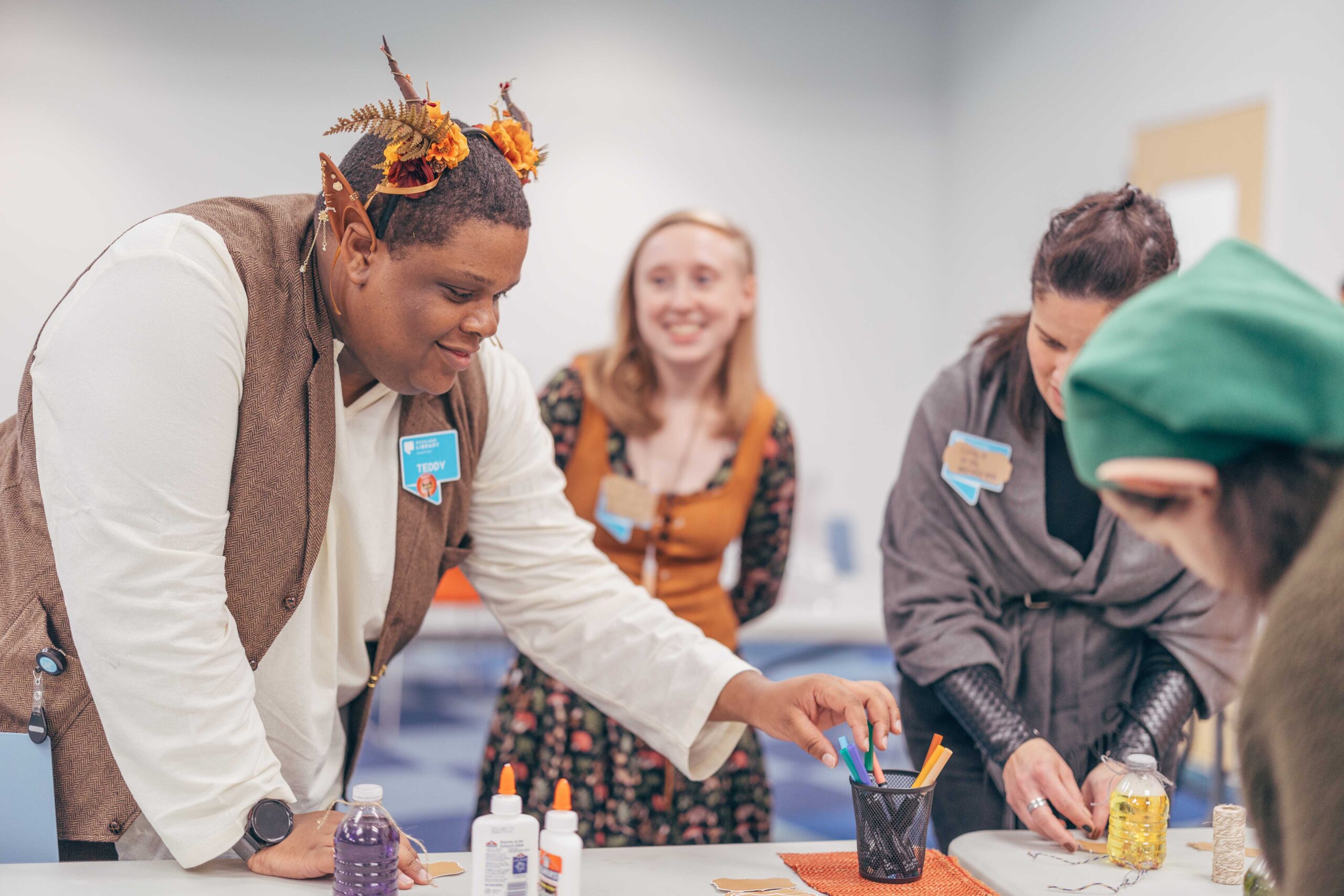 Southeast’s Social Meeting Lab turned into a medieval market. We made signs out of cardboard (painted to look like wood), hung red tablecloths like curtains, and I constructed a cardboard castle backdrop with wooden bracers for a photo-op. I also made a wishing well out of cardboard, tape, and spray paint. Staff who wanted to participate wore their elf ears, fairy wings, and other accessories that fit the vibe.