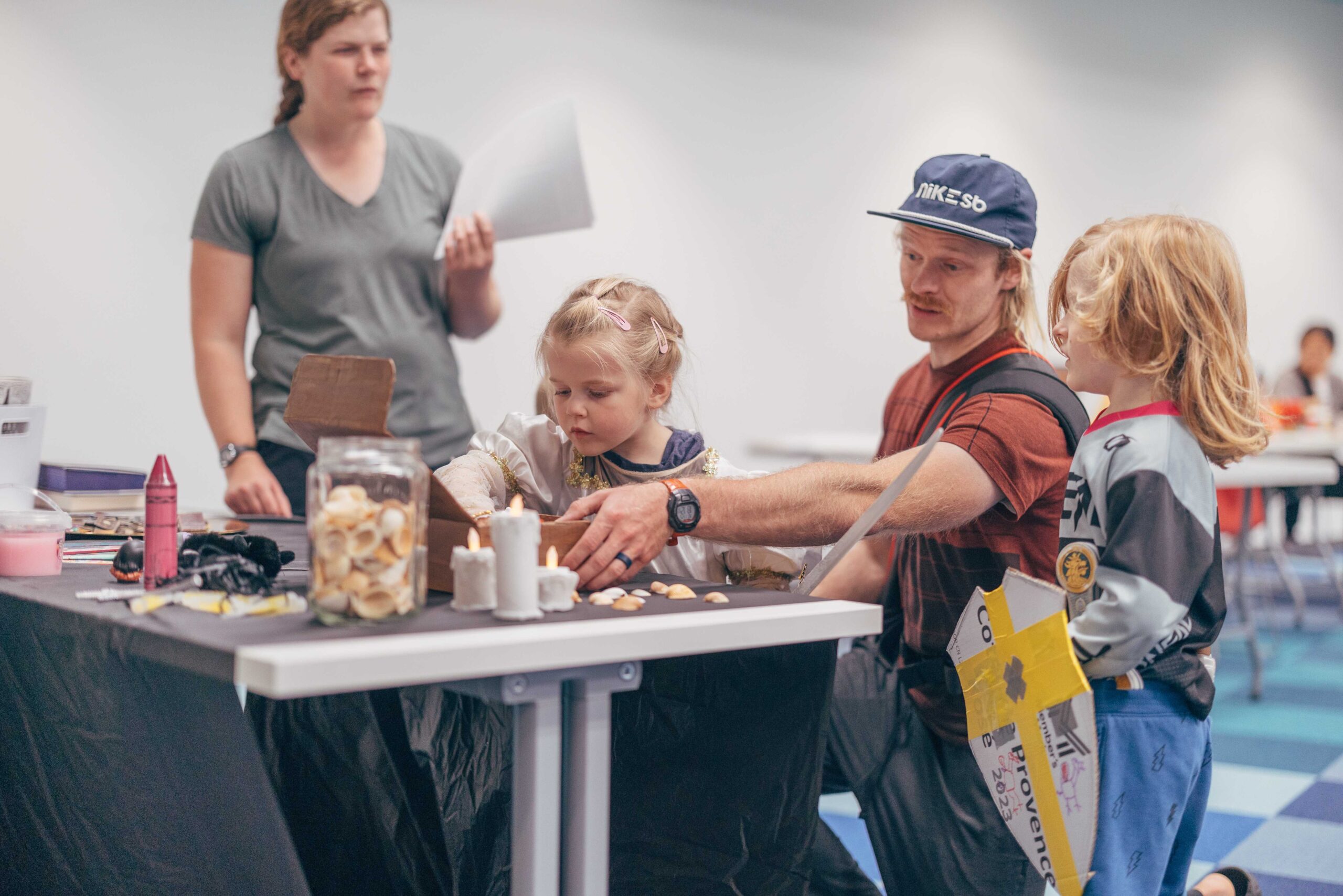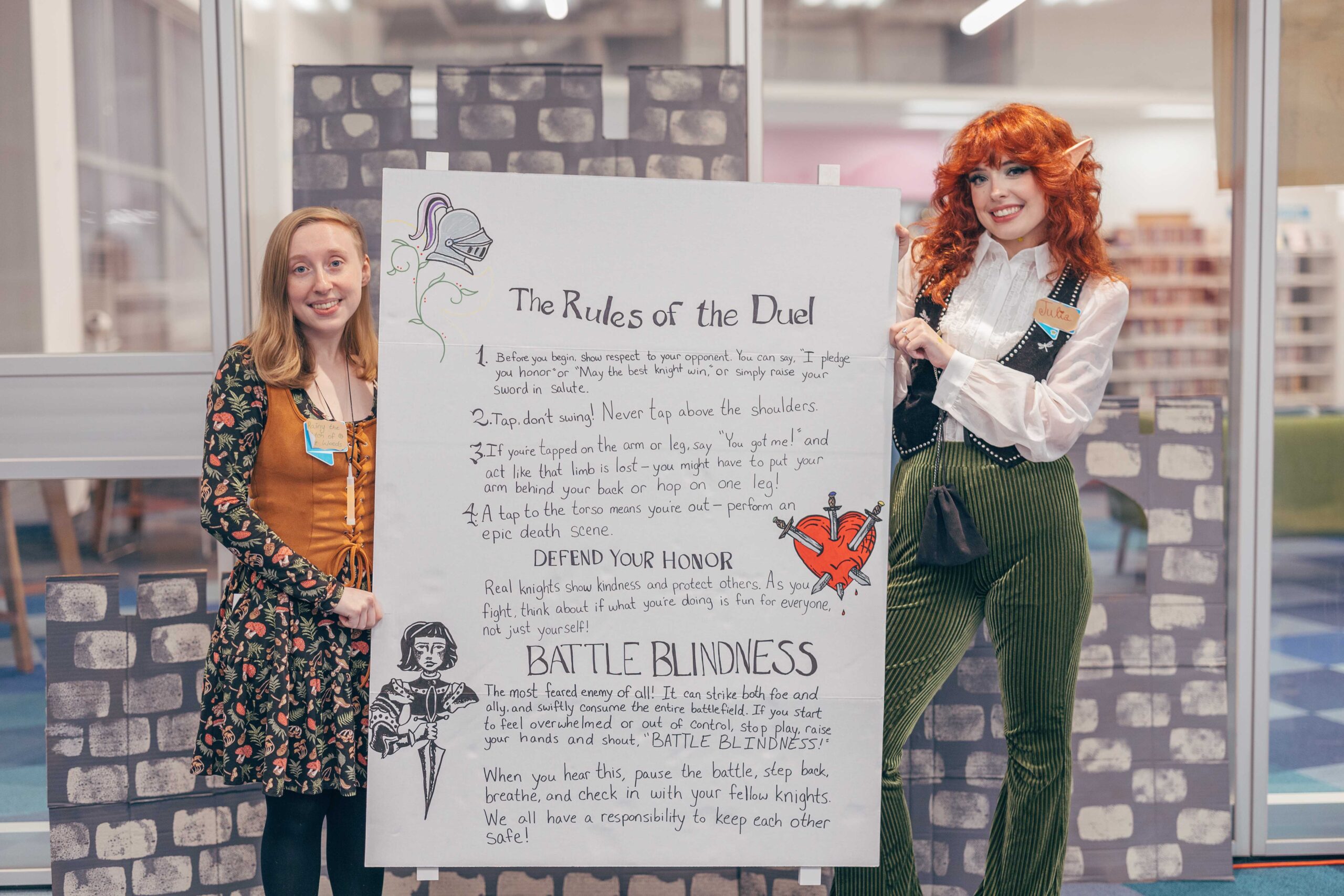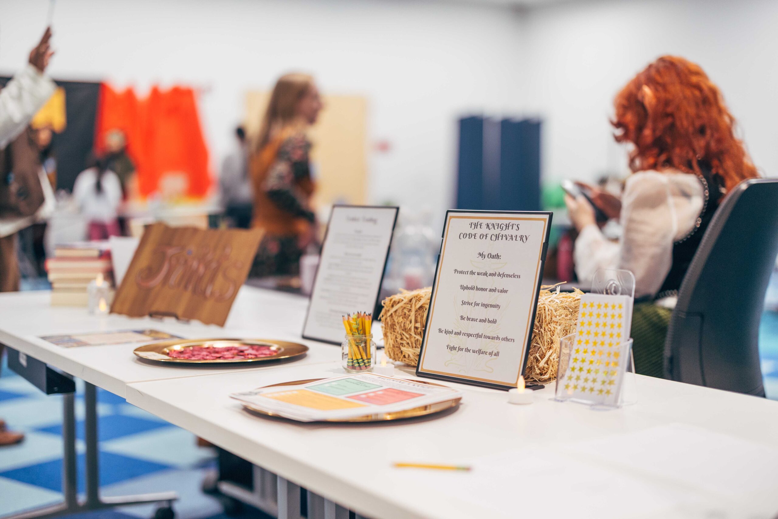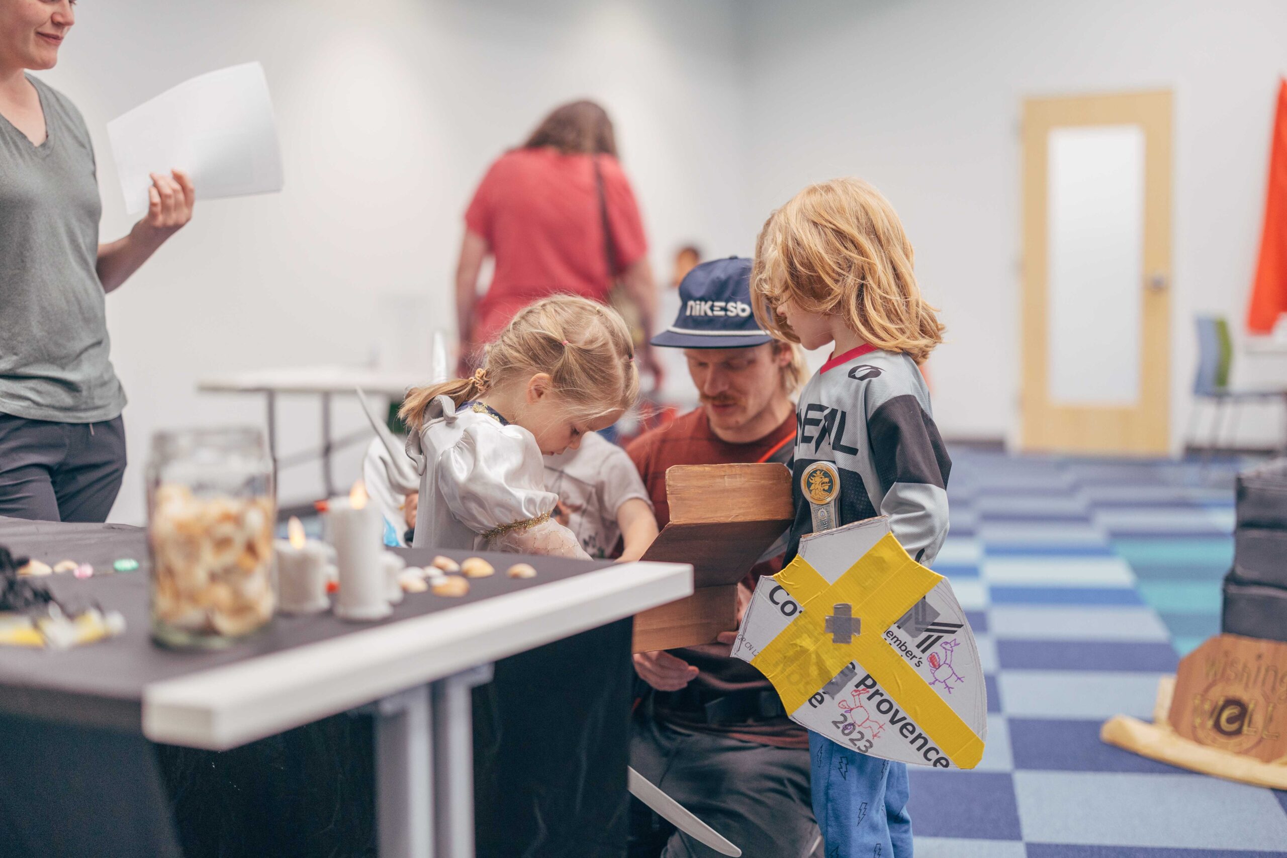 Activities included trinket trading, making your own coat of arms, making potion bottles, weaving looms, a dueling sword fight arena with foam swords, various riddles to solve, and a knighting ceremony. We also played “bardcore” versions of popular songs!